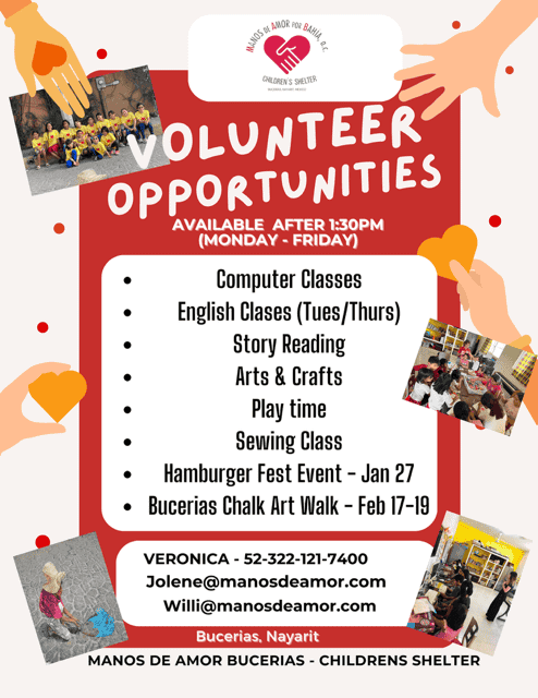To volunteer, please send a letter to jolene@manosdeamor.com that tells a bit about you and your background. What areas would be of most interest to you and how often would you be available to work?